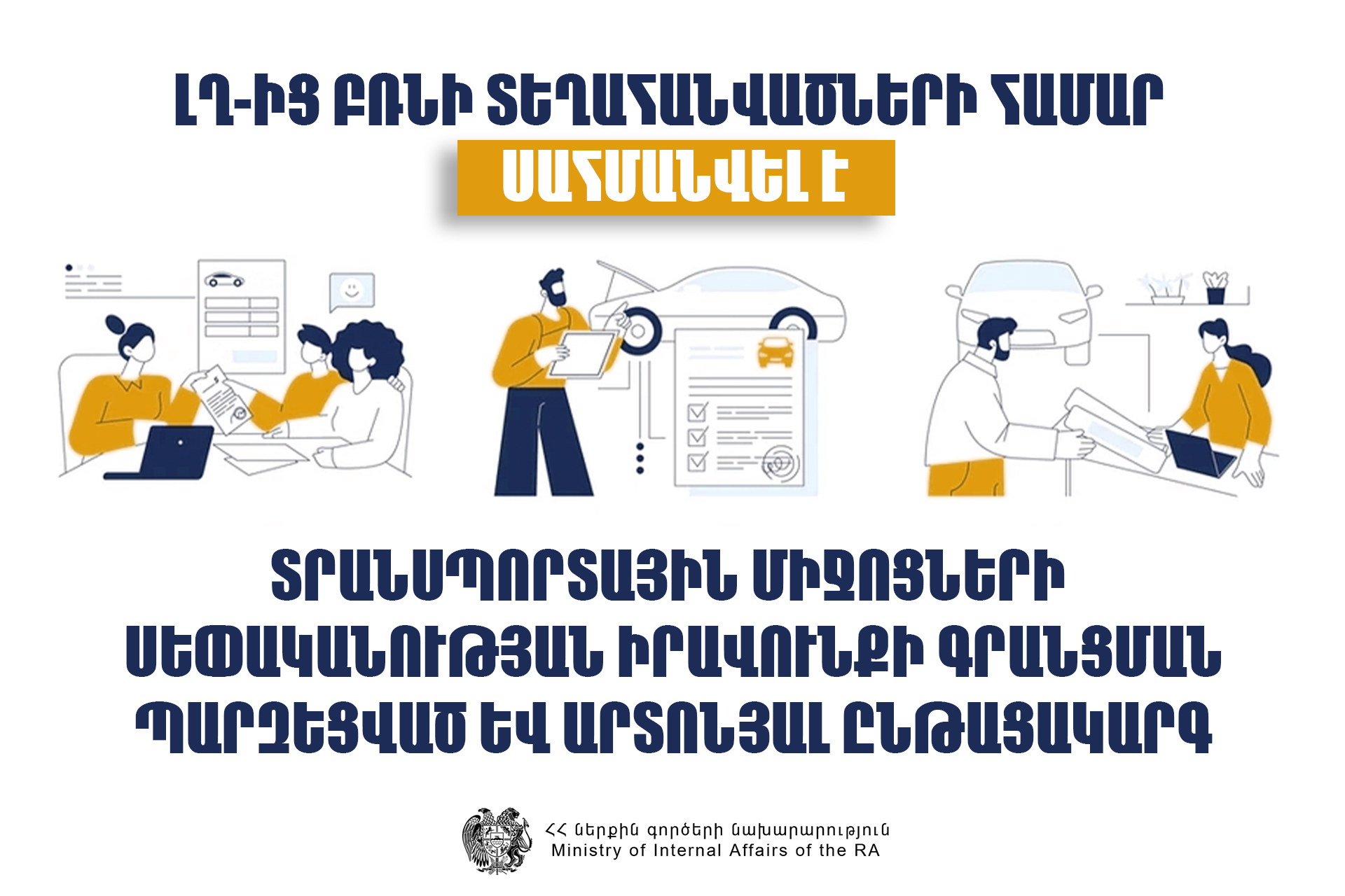 Ըստ այդմ՝ նախատեսվում է մինչև 2017 թ. արտադրության թեթև մարդատար ավտոմոբիլների նկատմամբ սեփականության իրավունքի պետական գրանցման ժամանակ բռնի տեղահանված անձանցից չպահանջել տրանսպորտային միջոցի ձեռք բերման օրինականությունը հավաստող փաստաթուղթ և սեփականության իրավունքի գրանցումը կատարել նշված տրանսպորտային միջոցների տիրապետման կամ օգտագործման օրինականությունը հավաստող այլ փաստաթղթի հիման վրա։
