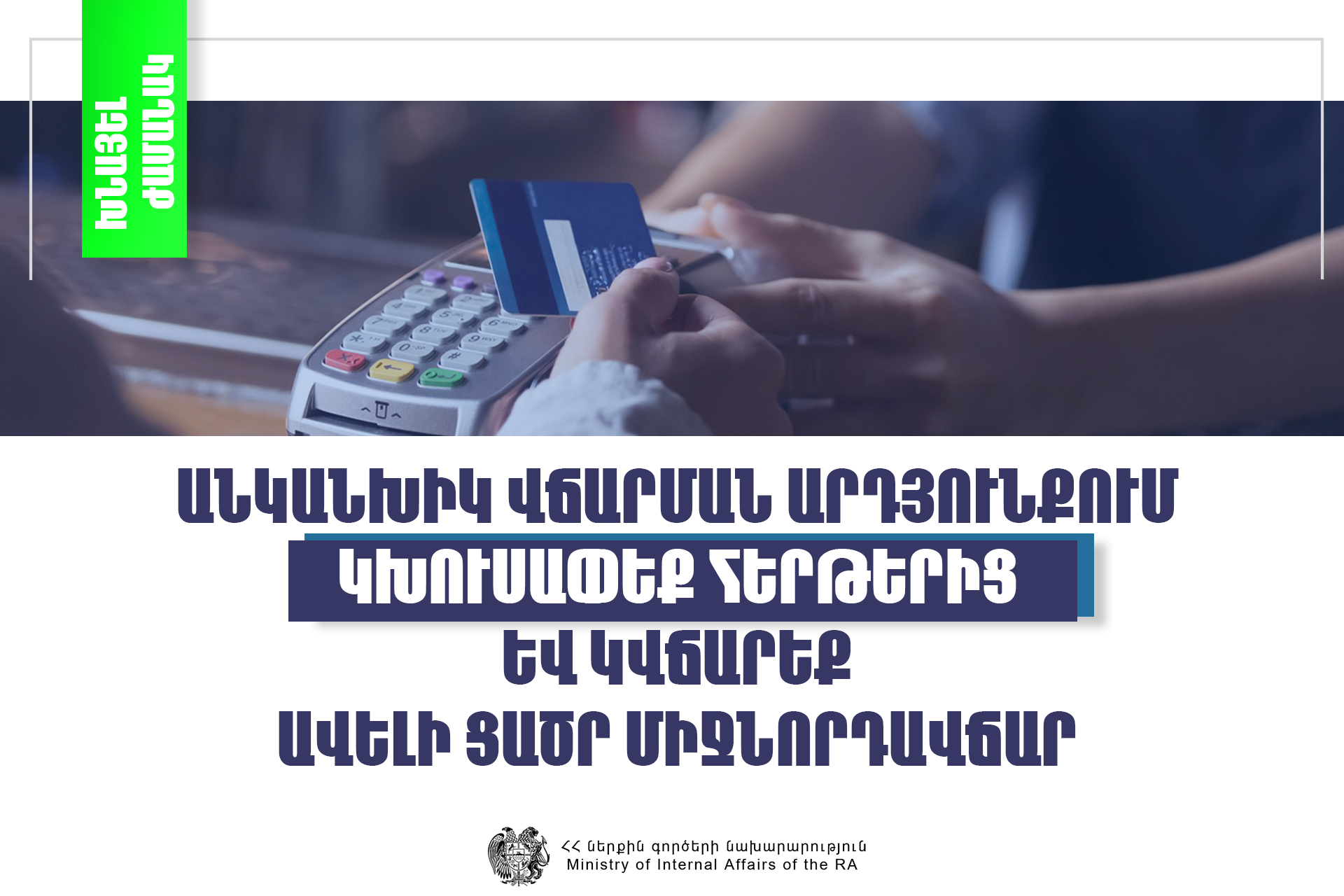 Ներքին գործերի նախարարությունը հորդորում է Երևանի և մարզերի հաշվառման քննական բաժիններում սպասարկվելիս վճարումը կատարել POS տերմինալներով՝ քարտային տարբերակով, հերթերից խուսափելու և հնարավորինս արագ սպասարկվելու նպատակով։