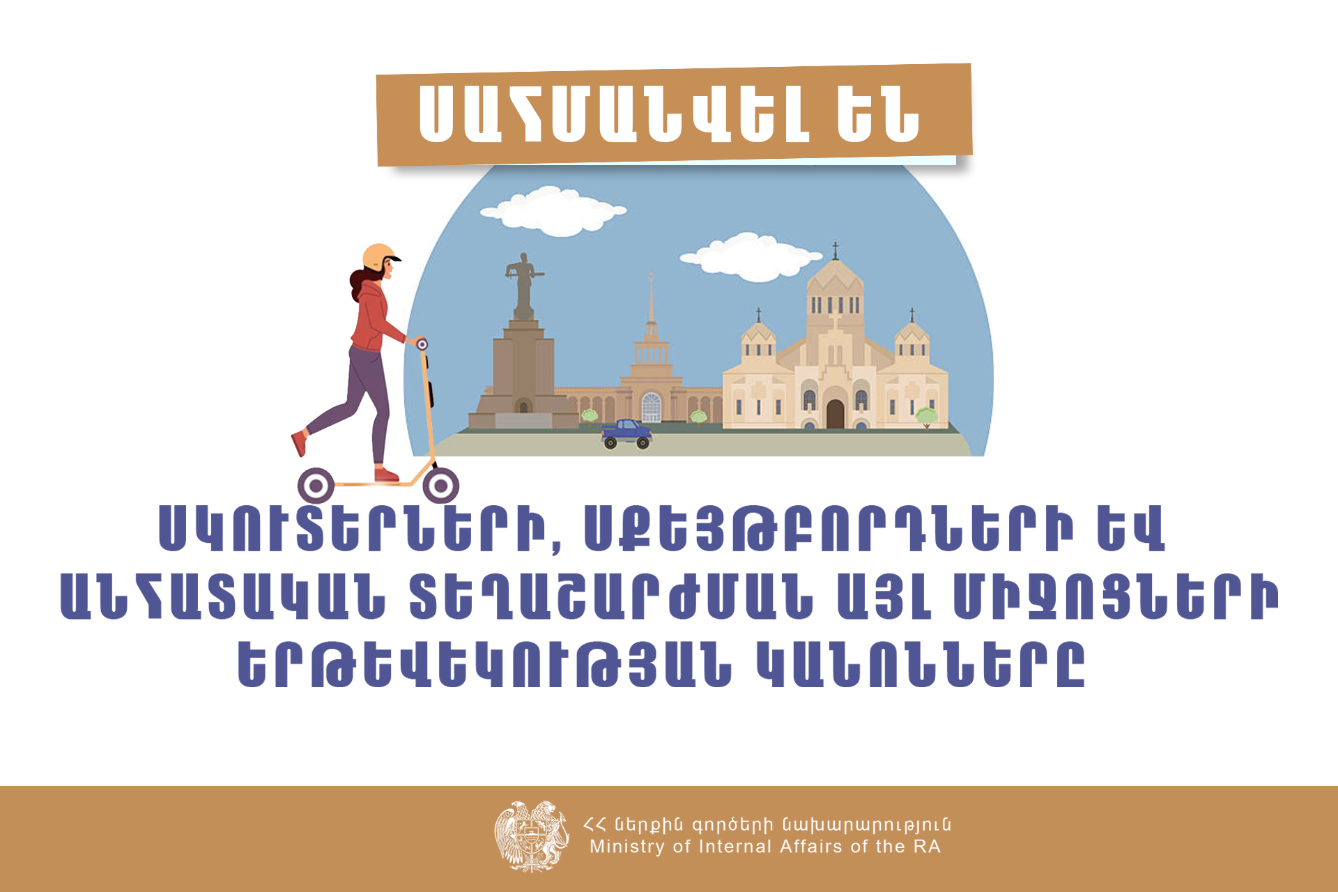 ՀՀ Ազգային ժողովի կողմից ընդունված ««Ճանապարհային երթևեկության անվտանգության ապահովման մասին» օրենքում լրացումներ և փոփոխություն կատարելու մասին» և «Վարչական իրավախախտումների վերաբերյալ ՀՀ օրենսգրքում փոփոխություններ և լրացումներ կատարելու մասին» օրենքների նախագծերի փաթեթով կկանոնակարգվի անհատական շարժունակության (տեղաշարժման) միջոցներով երթևեկությունը։