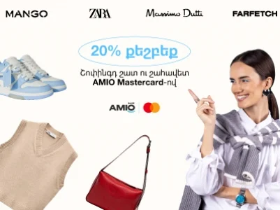 Ամիօ բանկը Mastercard-ի հետ մեկնարկել է բացառիկ ակցիա շոփինգի սիրահարների համար։ Մինչև 15.01.2025-ը ներառյալ, կատարելով գնումներ Zara, Mango, Massimo Dutti և Farfetch խանութներից՝ Ամիօ բանկի Mastercard Digital, Gold, Platinum և World Elite տեսակի քարտերով, կստանաք 20% քեշբեք։ Հայաստանից կարող եք գնումներ կատարել օնլայն տարբերակով, իսկ արտերկրում և՛ օնլայն տարբերակով, և՛ նշված խանութներից: