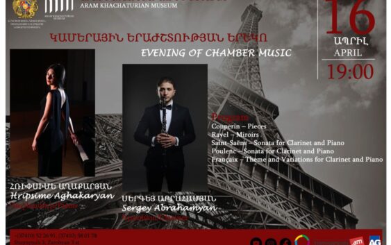 Ապրիլի 16-ին՝ ժամը 19։00-ին Արամ Խաչատրյանի տուն-թանգարանի համերգասրահում, Ֆրանկոֆոնիայի օրերի շրջանակներում տեղի կունենա կամերային երաժշտության համերգ։ Ելույթ կունենան երիտասարդ, տաղանդավոր երաժիշտներ, միջազգային մրցույթների դափնեկիրներ՝ Հռիփսիմե Աղաքարյանը /դաշնամուր/ Սերգեյ Աբրահամյանը /կլառնետ/: Երեկոյի ընթացքում կհնչի ֆրանսիացի դասականների նրբաճաշակ ստեղծագործությունների բացառիկ մի ընտրանի՝ Կուպերեն – Պիեսներ Ռավել – Արտացոլանքներ Սեն-Սանս – Սոնատ կլառնետի և դաշնամուրի համար Պուլենկ – Սոնատ կլառնետի և դաշնամուրի համար Ֆրանսե – Թեմա և վարիացիաներ կլառնետի և դաշնամուրի համար Հանդիսատեսը հնարավորություն կունենա նաև ծանոթանալու տուն-թանգարանի ցուցադրությանը։