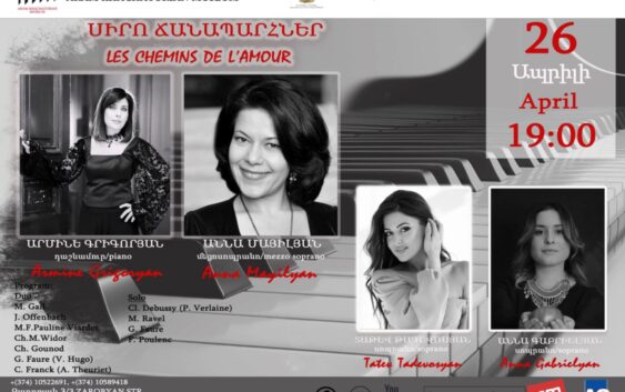 Ֆրանկոֆոնիայի օրերի շրջանակներում ապրիլի 26-ին, ժամը՝ 19:00-ին Արամ Խաչատրյանի տուն-թանգարանը սիրով հրավիրում է իր հյուրընկալ համերգասրահ «Les chemins de l’amour / Սիրո ճանապարհներ» խորագրով համերգին: Կհնչեն ֆրանսիացի հայտնի կոմպոզիտորների ճանաչված ստեղծագործություններ՝ մեներգեր և զուգերգեր:
