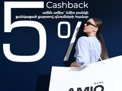 Հուլիսի 1-ից Ամիօն մեկնարկել է ակցիա, որի շրջանակում բանկի նոր քարտապանները կստանան 5% քեշբեք՝ իրենց քարտերով կատարած գնումների համար։