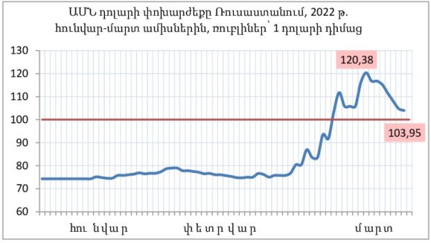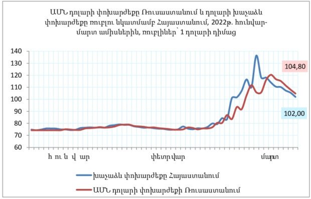 Հետեւյալ գրաֆիկում ներկայացված է Ռուսաստանում ԱՄՆ դոլարի փոխարժեքի դինամիկան, եւ Հայաստանում ռուսական ռուբլու նկատմամբ դոլարի փոխարժեքը՝ ըստ այս տարվա հունվար-մարտ ամիսների համար օրական ցուցանիշի։ Մարտի 19-ին, ըստ փոխարժեքի, Հայաստանում դոլարը հավասար էր 102,8 ռուբլու, իսկ այս համաշխարհային արժույթի պաշտոնական փոխարժեքը Ռուսաստանում՝ 104,8 ռուբլի էր։ Այս ցուցանիշների տարբերությունն ընդամենը 2,7 տոկոս է կազմում։