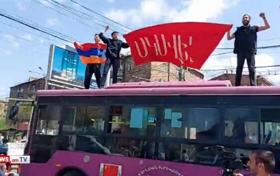 Նրանցից մի քանիսը բարձրացել են ուղևորատոր ավտոբուսի վրա՝ պարզել Արցախի դրոշն ու «Սկսել ա» գրությամբ պաստառը։