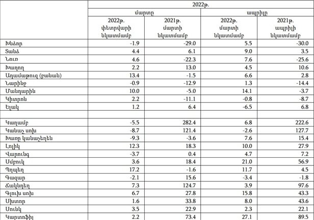 Անցած տարվա գյուղատնտեսության ոլորտի 1,1% անկումը, ինչպես նաև այս տարվա առաջին եռամսյակում գյուղմթերքի արտադրության ծավալների 5,6 տոկոս կրճատումը իր մեծ ազդեցությունն է թողել բանջարեղենի շուկայում։ Մասնավորապես՝ 2022թ. ապրիլին 2021թ. ապրիլի համեմատ բանջարեղենի գներն աճել են 48.8%-ով։Կանաչ սոխը թանկացել է 127,7%, կաղամբի գինը՝ 222,6%, կարտոֆիլինը՝ 89,5%, գազարինը՝ 97,6%, լոլիկինը՝ 27,9%-ով։