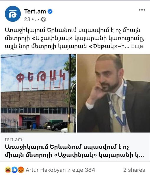 Օրերս հայտնի դարձավ , որ Երևանում մետրոյի ևս մեկ միջանկյալ կայարան կկառուցվի «Փեթակ» առևտրային կենտրոնի հարևանությամբ։ Տեղեկությունը հայտնում է Հայաստանի պետական հետաքրքրությունների ֆոնդի (ANIF) տնօրենների խորհրդի նախագահ Տիգրան Ավինյանը։