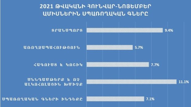2021 թվականի նոյեմբերին նախորդ տարվա նոյեմբերի համեմատ սննդամթերքի գներն աճել են ավելի քան 16,9 տոկոսով, հագուստը և կոշիկը՝ 12,1 տոկոսով, տրանսպորտը՝ 8,5 տոկոսով, առողջապահությունը՝ 4,5 տոկոսով և այլն։