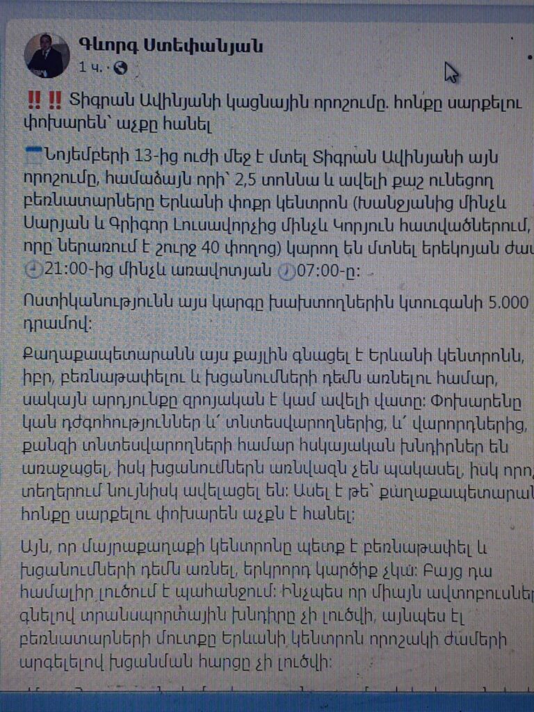նոյեմբերի 13-ից ուժի մեջ է մտել Տիգրան Ավինյանի այն որոշումը, համաձայն որի՝ 2,5 տոննա և ավելի քաշ ունեցող բեռնատարները Երևանի փոքր կենտրոն (Խանջյանից մինչև Սարյան և Գրիգոր Լուսավորչից մինչև Կորյուն հատվածներում, որը ներառում է շուրջ 40 փողոց) կարող են մտնել երեկոյան ժամը 21։00-ից մինչև առավոտյան 07։00-ը։